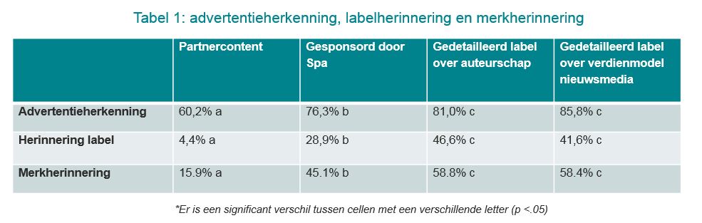 In dit onderzoek herkenden vrij veel lezers de advertentie als zodanig. Mogelijk komt dit doordat we het label vrij prominent hadden gemaakt en doordat ook in de tekst naar de adverteerder (Spa) werd verwezen.